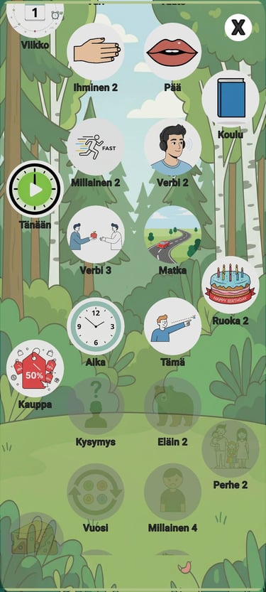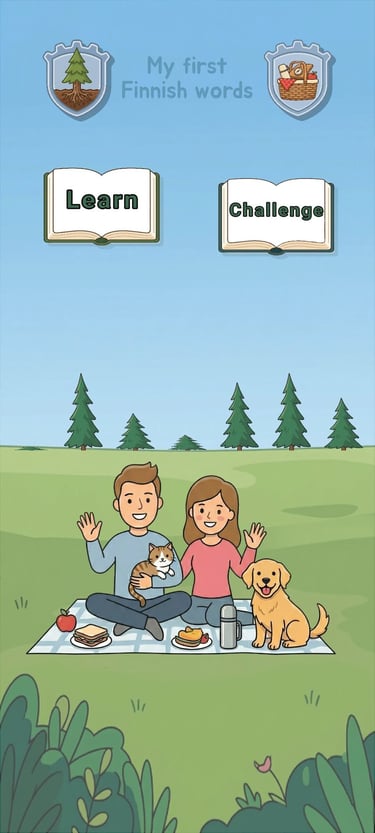 Furry Friends: Meet your first animals, including Kissa (Cat), Koira (Dog), and Lintu (Bird).